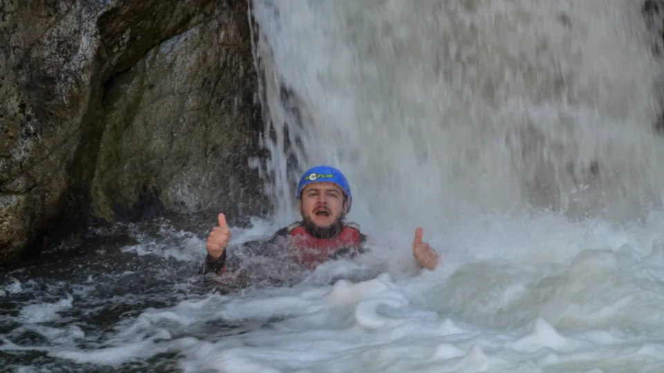 Екипирани, от базата се насочвате към водопадите в средата на каньона. Преминавате реката няколко пъти, нагазвате до кръста във вода и стигате до два водопада. Там всеки прави, каквото прецени - плува под водопада, скача, снима се.