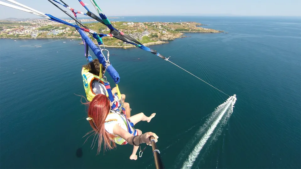Излитането и кацането при парасейлинга стават от и на борда на паракрафт (специализиран плавателен съд). Полетът се прави с помощта на парашут, който може да се издигне до 150 метра височина и да Ви позволи да се насладите на страхотна гледка и емоции. Възможен престой на паракрафта: 40-50 мин., в зависимост от броя на участниците записани за часа.