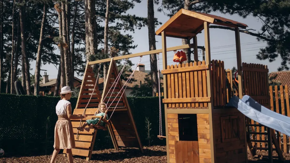 Навън ви очаква целогодишен отопляем басейн и отделен детски басейн с топла вода, джакузи с минерална вода за осем души и сауна тип бъчва с ароматерапия. Солната стая, релакс зоната и детската площадка са включени в цената на престоя, а за още по-пълноценна почивка се предлагат и масажи на място. Децата могат да се забавляват на голямата площадка с батут или на кино под звездите с домашни пуканки, докато възрастните се отпускат в хамаците сред боровете и се наслаждават на панорамната гледка към града.